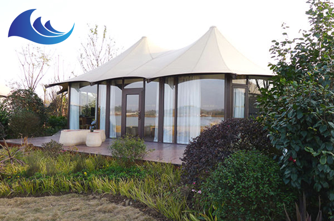 帳篷酒店采用高強度中空鋁合金結(jié)構(gòu)或者是鋼結(jié)構(gòu),表面具備有防腐處理,優(yōu)選膜結(jié)構(gòu)頂棚,安全耐用,防水、阻燃、防紫外線。