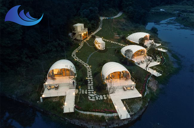 帳篷酒店采用高強(qiáng)度中空鋁合金結(jié)構(gòu)或者是鋼結(jié)構(gòu),表面具備有防腐處理,優(yōu)選膜結(jié)構(gòu)頂棚,安全耐用,防水、阻燃、防紫外線。
